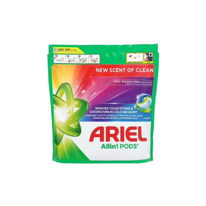 Capsulele de rufe Ariel indeparteaza eficient petele, ingrijesc hainele si le confera un parfum proaspat si curat. De ce sa cumparati? Caracteristici si beneficii Alegand capsulele de rufe Ariel All-in-1 PODS color, obtineti: Rufe fara pete de prima data, de fiecare data Rezultate excelente de spalare chiar si la 20°C Protectie a culorii si a tesaturii Rufe curate fara a utiliza agenti de indepartare a petelor ,haine care miros proaspat pentru o lunga perioada de timp