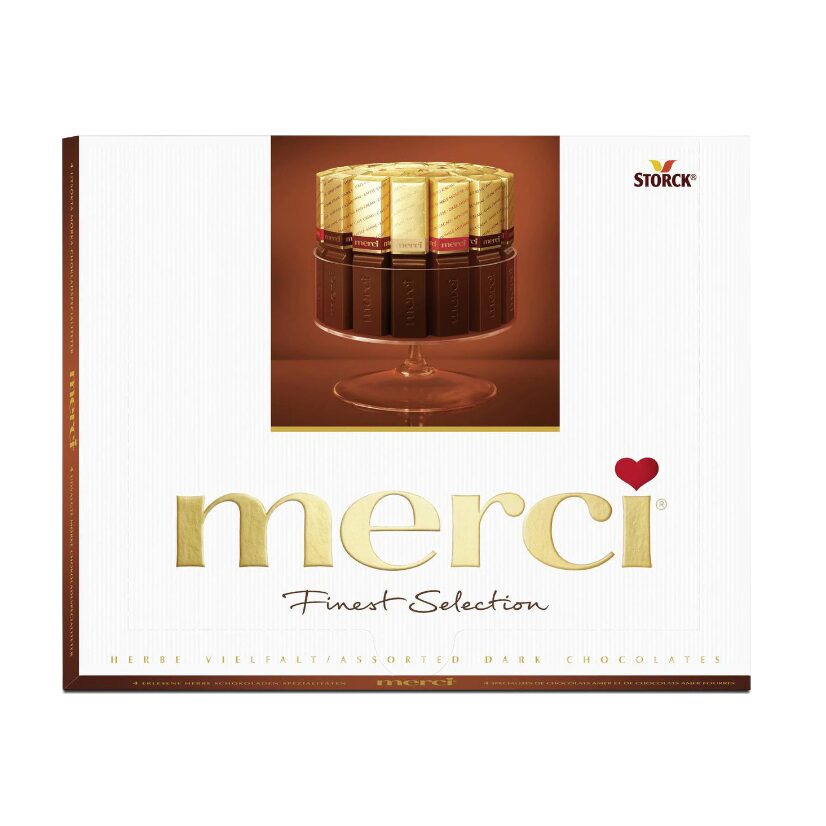 Bomboane de ciocolata asortate Merci dark, 250 gr.4 sortimente de ciocolata si ciocolata umpluta, asortata. Ciocolata alba si ciocolata cu umplutura cu cafea si smantana dulce - Ciocolata amaruie cu umplutura cu spuma de cacao - Ciocolata amaruie cu umplutura cu smantana dulce - Ciocolata cu umplutura cu martipan. Merci, fiindca esti tu.