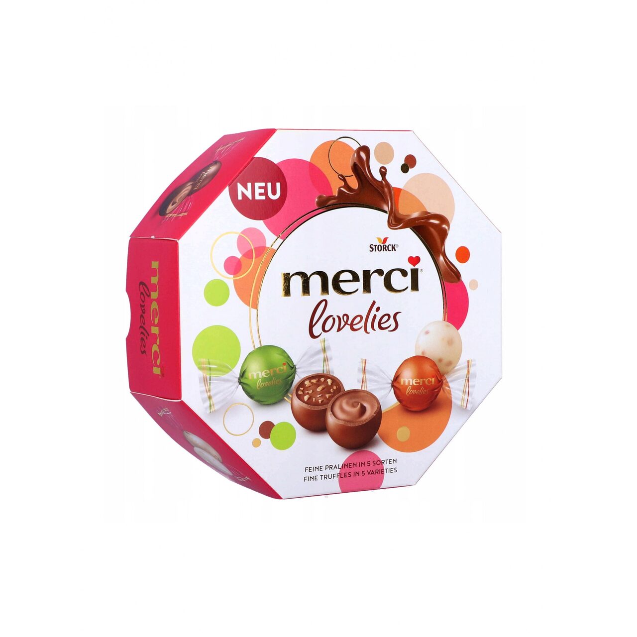 Praline ciocolata Merci lovelies 5 sortimente.Ingrediente: zahăr, unt de cacao, masă de cacao, LAPTE INTEGRAL, masa de cacao, grăsime de nucă de cocos, alune măcinate (4.5%), grăsime de unt, pudra zer, lapte praf, lactoză, faina de grau, migdale maruntite (1.1 %), lecitine emulgatoare (soia), fructoza, arome, sare.Produsul poate conține alune, migdale, arahide, nuci, ou.A se pastra in loc uscat si racoros.
