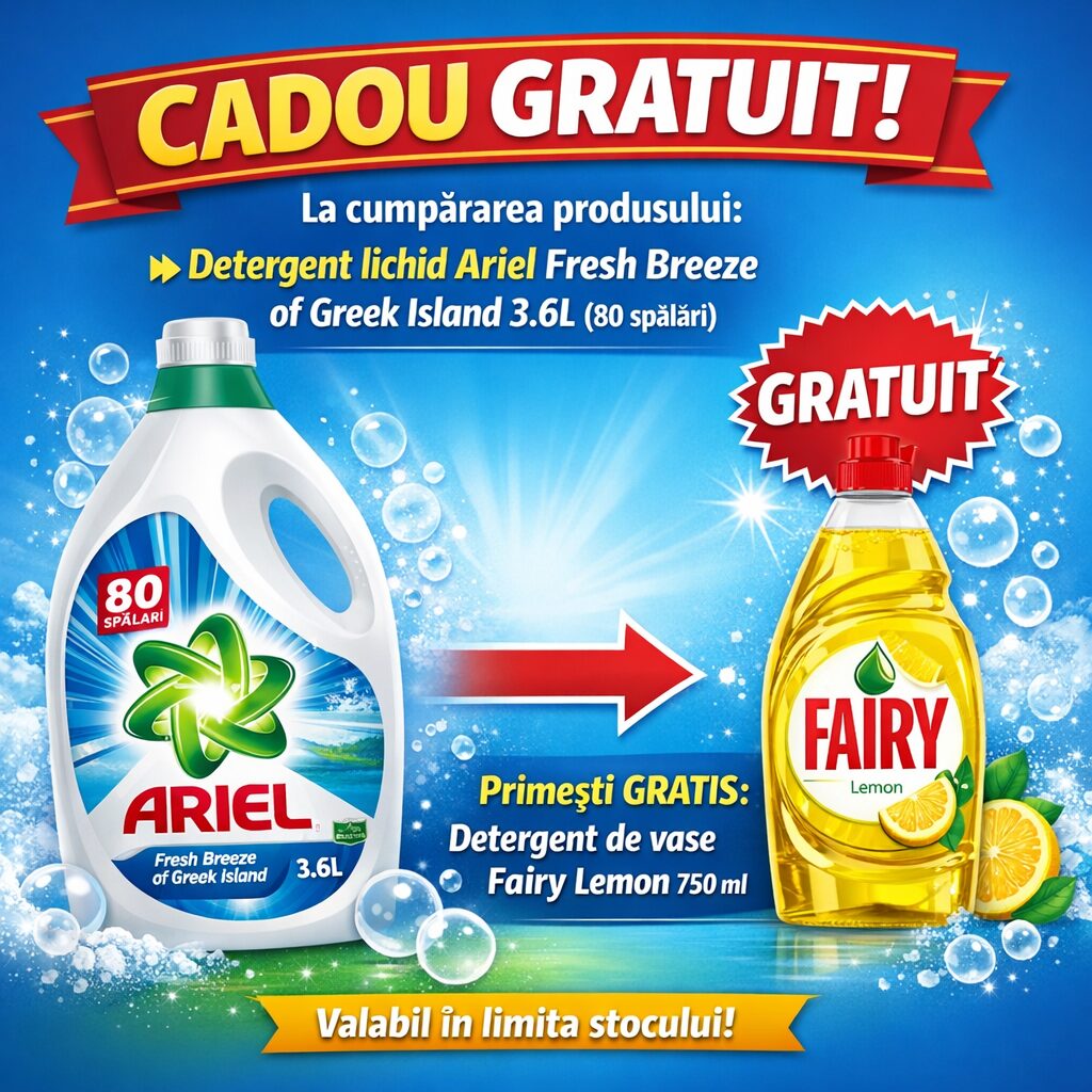 Cumpara Detergent lichid Ariel Fresh Breeze of Greek Island – Ediție limitată si primesti GRATUIT un Detergent de vase Fairy Lemon, 750 ml