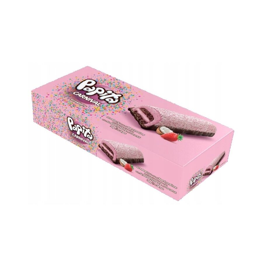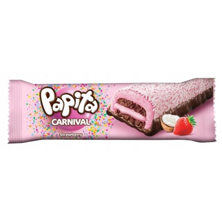 Papita Carnival Tort cu căpșuni și cacao (25,7%) cu sos de căpșuni (26,4%) cu spumă de bezea (22,2%), în glazură de cacao (19,4%), presărat cu nucă de cocos (6,3%).