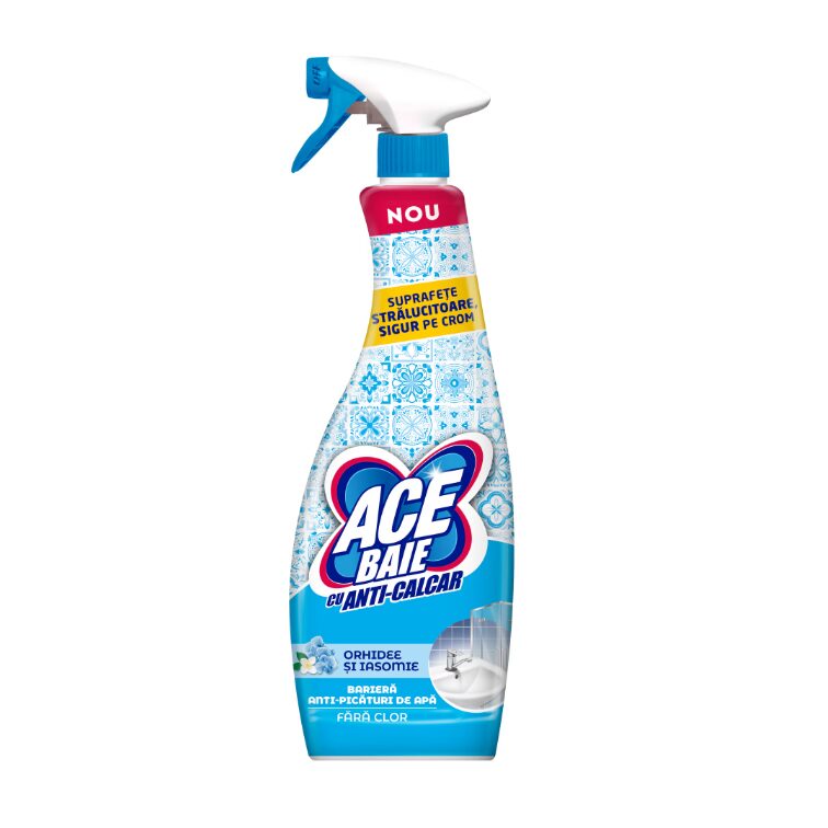 Noul Spray Anticalcar pentru Baie ACE: eficient chiar si impotriva celor mai persistente depuneri. Raspandeste o placuta aroma de orhidee si iasomie in jurul tau. In plus fata de indepartarea calcarului, previne formarea urmelor de apa datorita barierei anti-stropire.